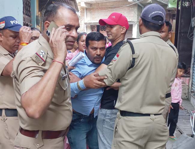 उत्तराखंड के मुख्यमंत्री पुष्कर सिंह धामी के हल्द्वानी दौरे से पहले विरोध की तैयारी कर रहे युवा कांग्रेस नेताओं के खिलाफ प्रशासन ने सख्त रुख अपनाया। सोमवार को कांग्रेस के युवा प्रदेश उपाध्यक्ष हेमंत साहू के राजपुरा स्थित आवास पर भारी पुलिस बल ने दबिश दी। इस दौरान कांग्रेस कार्यकर्ताओं ने जोरदार नारेबाजी करते हुए “मुख्यमंत्री वापस जाओ”, “गरीबों के मकानों से लाल निशान हटाओ” जैसे नारे लगाए।