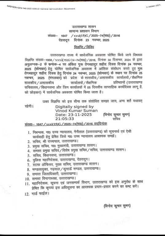 उत्तराखंड सरकार ने अपने सार्वजनिक अवकाशों की सूची में थोड़ा बदलाव किया है। पहले सरकार ने 30 दिसंबर 2024 को जारी आदेश में यह तय किया था कि **24 नवंबर 2025 (सोमवार)** को *गुरु तेगबहादुर शहीद दिवस* के अवसर पर सार्वजनिक अवकाश रहेगा।