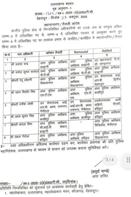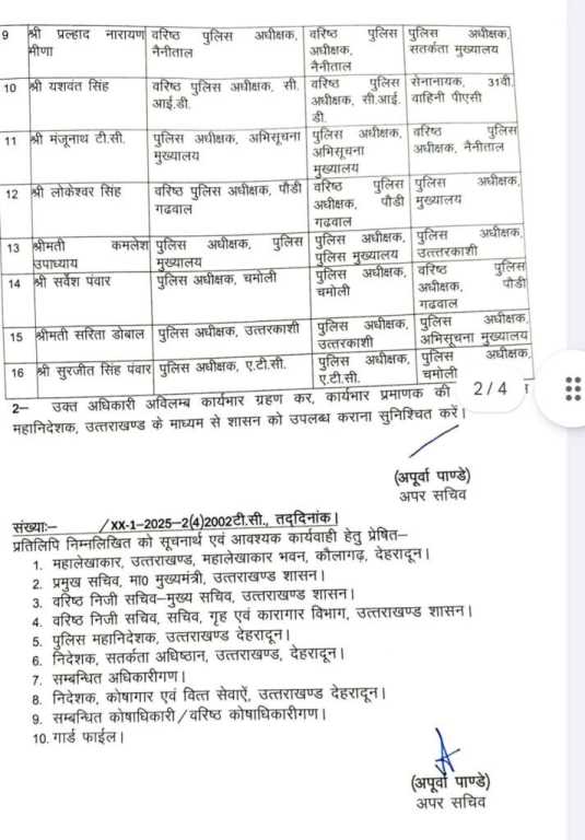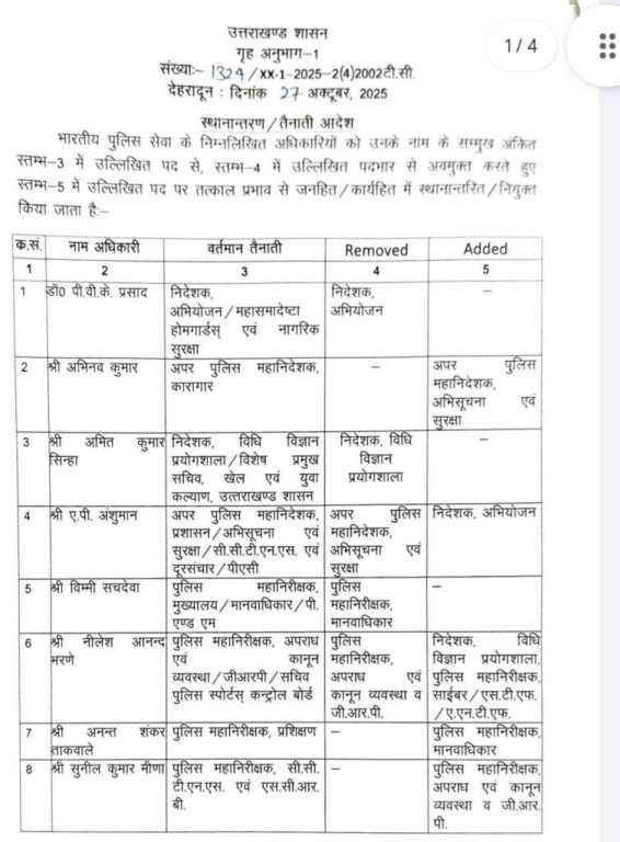 नई तबादला सूची के मुताबिक कुछ जिलों के एसएसपी समेत कई वरिष्ठ अधिकारियों को नई जिम्मेदारियां सौंपी गई हैं। बताया जा रहा है कि यह तबादले प्रशासनिक व्यवस्था को बेहतर बनाने के लिए किए गए हैं।